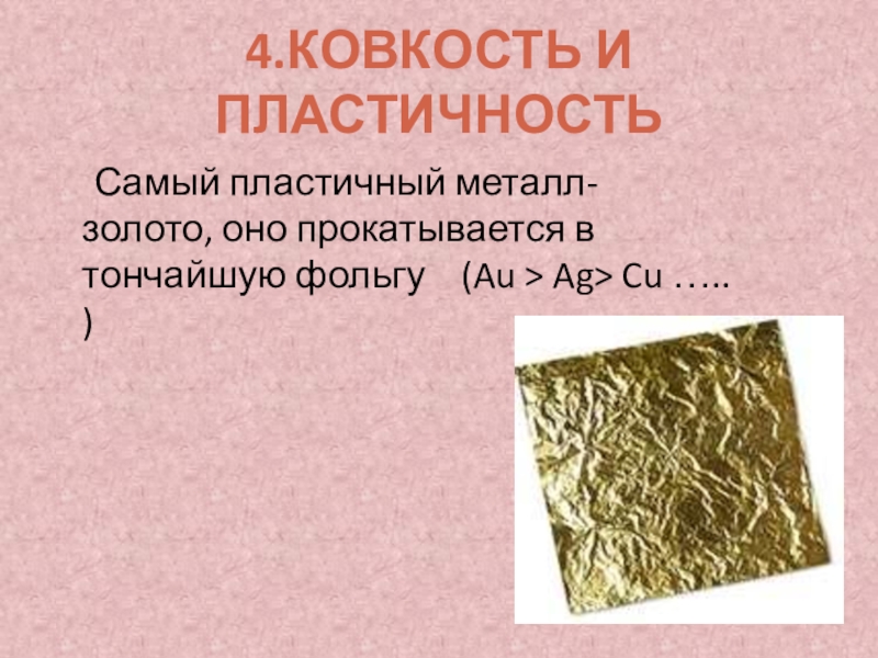 4.Ковкость и пластичность   Самый пластичный металл- золото, оно прокатывается в тончайшую фольгу  (Au >