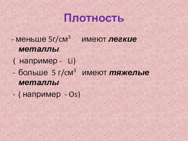 Плотность - меньше 5г/cм3    имеют легкие металлы  ( например -  Li)