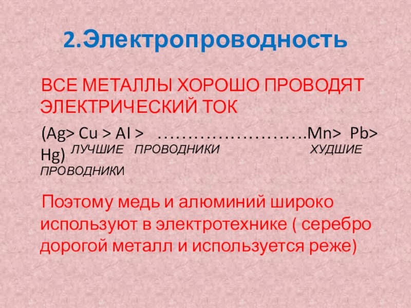 2.Электропроводность   ВСЕ МЕТАЛЛЫ ХОРОШО ПРОВОДЯТ ЭЛЕКТРИЧЕСКИЙ ТОК  (Ag> Cu > AI >  …………………….Mn>