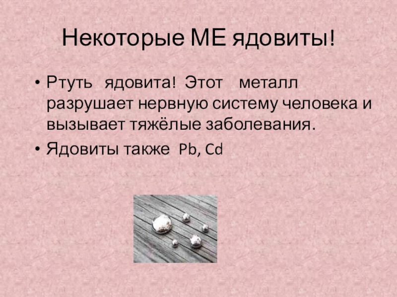 Некоторые МЕ ядовиты!Ртуть  ядовита! Этот  металл разрушает нервную систему человека и вызывает тяжёлые заболевания.Ядовиты также