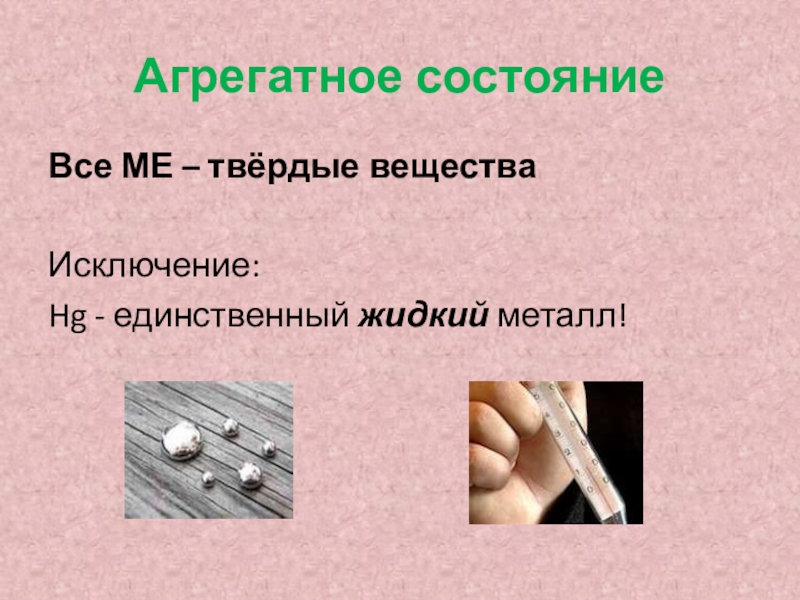 Агрегатное состояниеВсе МЕ – твёрдые веществаИсключение: Hg - единственный жидкий металл!