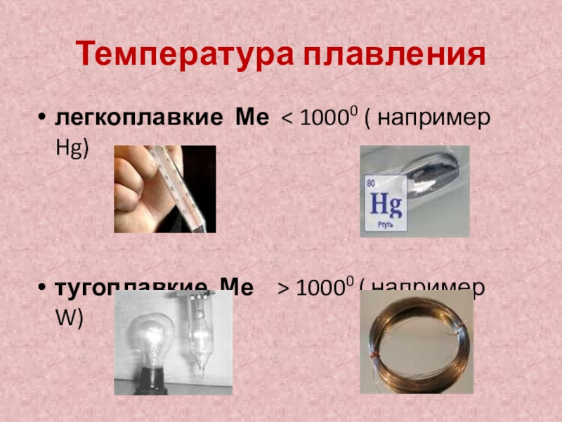 Температура плавления легкоплавкие Ме < 10000 ( например Hg)тугоплавкие Ме  > 10000 ( например  W)