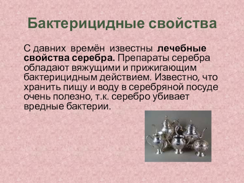 Бактерицидные свойства  С давних времён известны лечебные свойства серебра. Препараты серебра обладают вяжущими и прижигающим бактерицидным