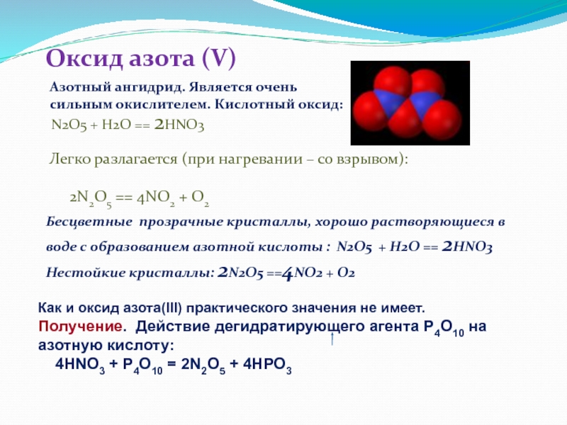 Азотный ангидрид. Является очень сильным окислителем. Кислотный оксид: