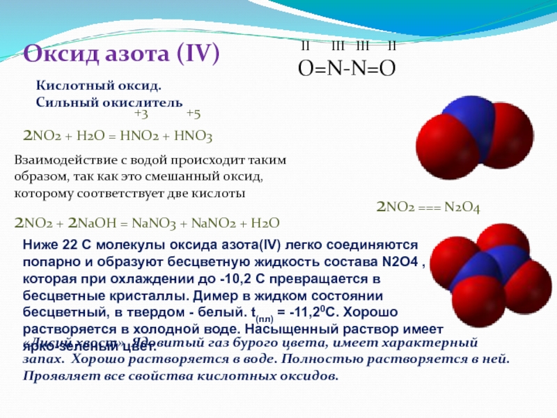Ниже 22 С молекулы оксида азота(IV) легко соединяются попарно и образуют бесцветную жидкость состава N2O4 , которая при охлаждении до -10,2 С превращается в бесцветные кристаллы. Димер в жидком состоянии бесцветный, в твердом - белый. t(пл) = -11,20С. Хорошо растворяется в холодной воде. Насыщенный раствор имеет ярко-зеленый цвет.