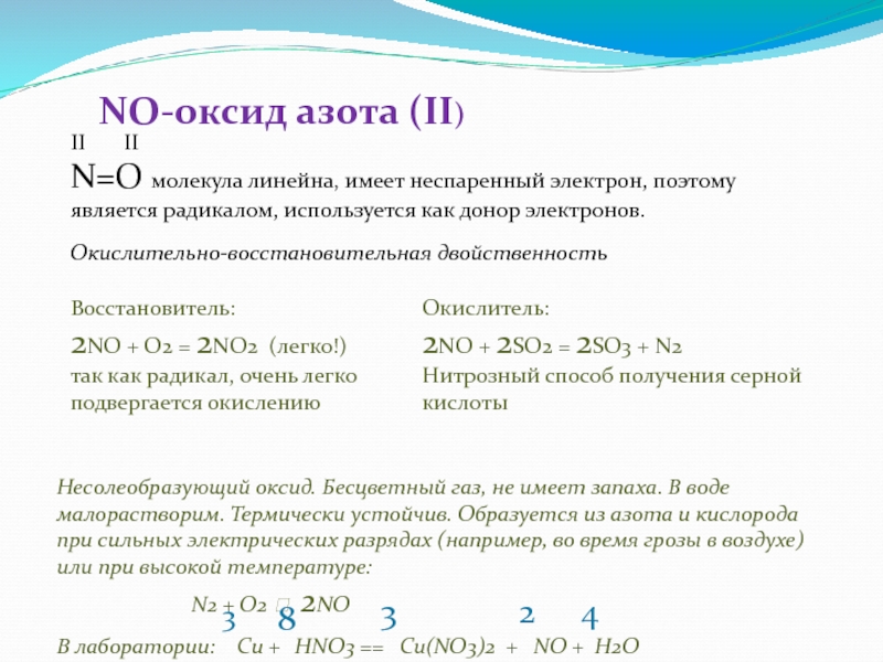 N=О молекула линейна, имеет неспаренный электрон, поэтому является радикалом, используется как донор электронов.