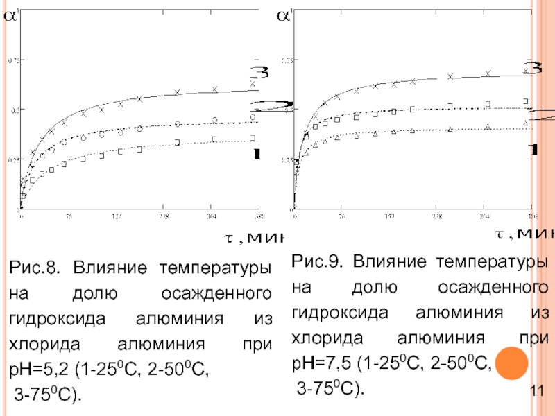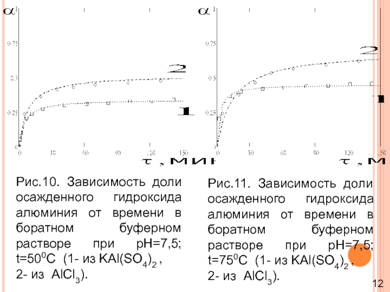 Рис.11. Зависимость доли осажденного гидроксида алюминия от времени в боратном буферном растворе при рН=7,5; t=750С (1- из KAl(SO4)2 ,