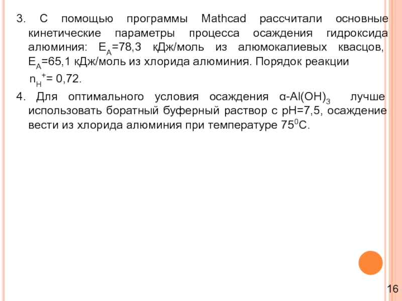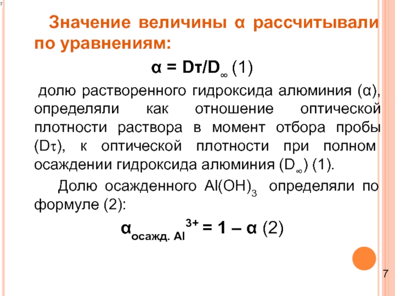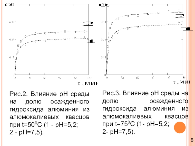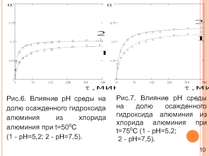 Рис.3. Влияние рН среды на долю осажденного гидроксида алюминия из алюмокалиевых квасцов при t=750C (1- pH=5,2;