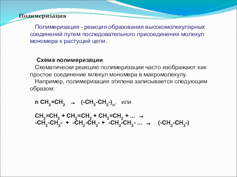 Схематически реакцию полимеризации часто изображают как простое соединение млекул мономера в макромолекулу.