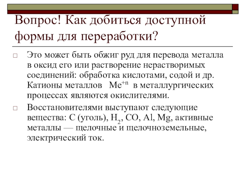 • Так как большинство металлов встречаются в природе в составе соединений, в которых металлы находятся в положительной степени окисления Ме+п, значит для того чтобы их получить в виде Ме0, необходимо про вести процесс восстановления.