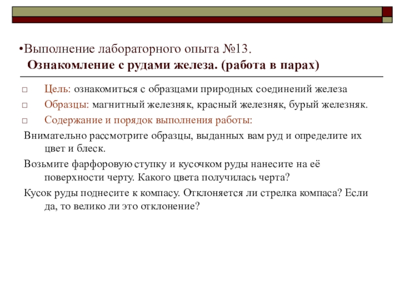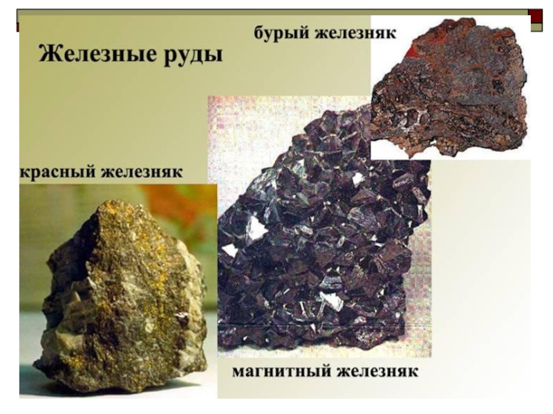 оксидов – магнитный железняк Fe3O4, красный железняк Fe2O3, бурый железняк, содержащий различные гидроксиды железа (III) Fe2O3 • Н2О.
