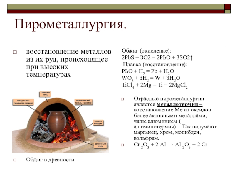 Отраслью пирометаллургии является металлотермия – восстановление Ме из оксидов более активными металлами, чаще алюминием ( алюминотермия). Так получают марганец, хром, молибден, вольфрам.