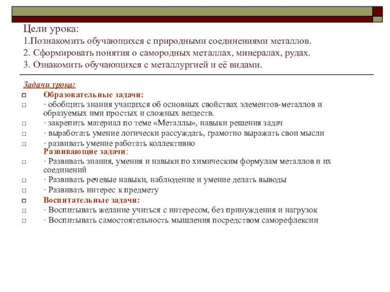 · Развивать знания, умения и навыки по химическим формулам металлов и их соединений