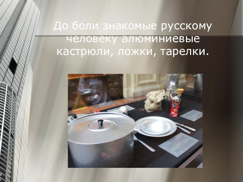 Слайд 17До боли знакомые русскому человеку алюминиевые кастрюли, ложки, тарелки.