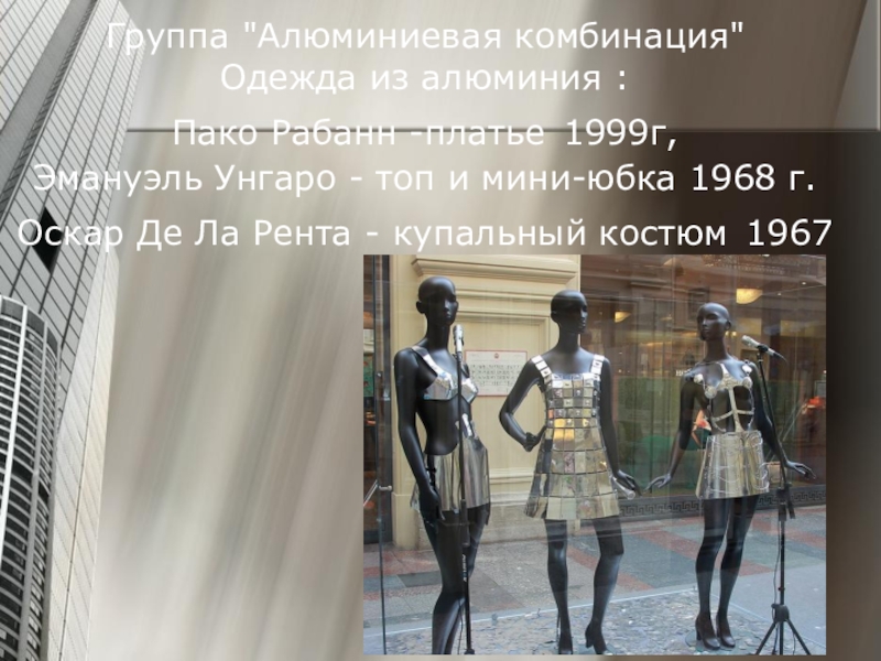 Слайд 6Группа "Алюминиевая комбинация" Одежда из алюминия : Пако Рабанн -платье 1999г, Эмануэль