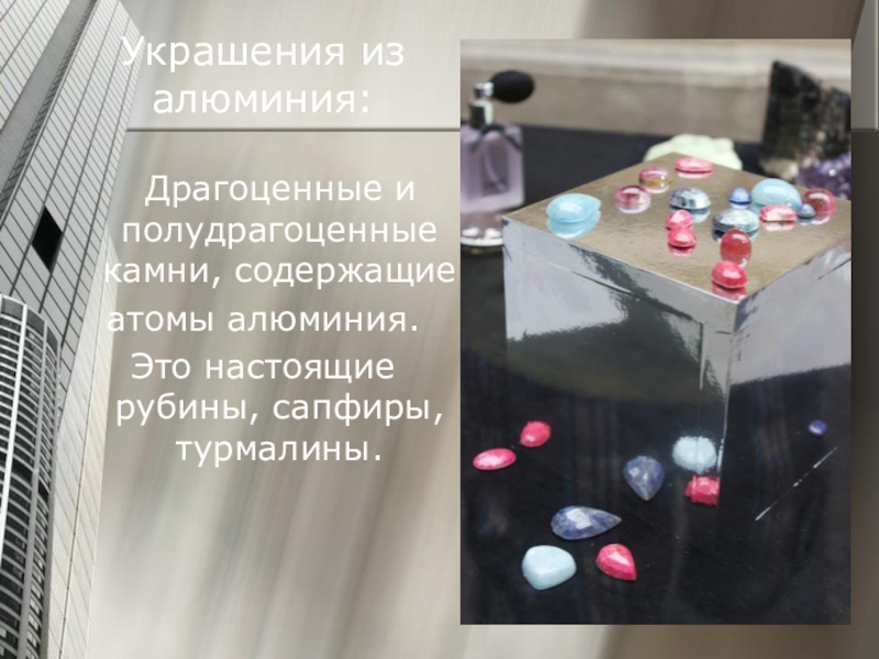 Украшения из алюминия:  Драгоценные и полудрагоценные камни, содержащие  атомы алюминия. Это настоящие рубины, сапфиры, турмалины.