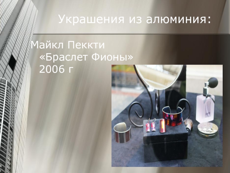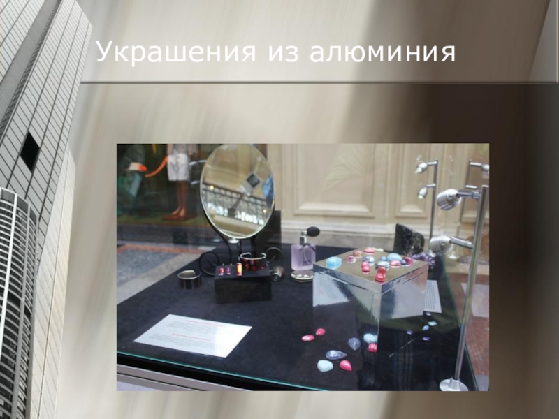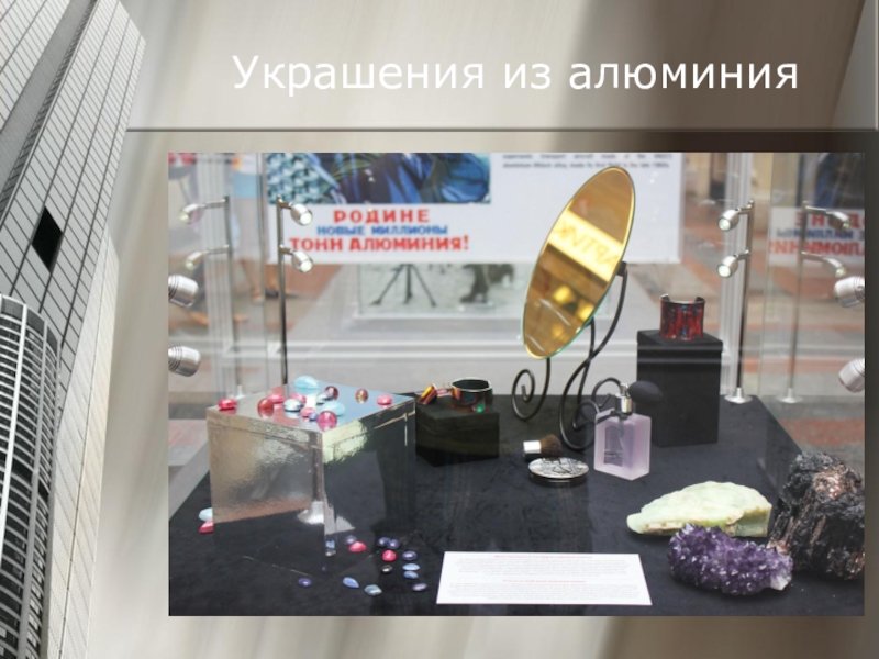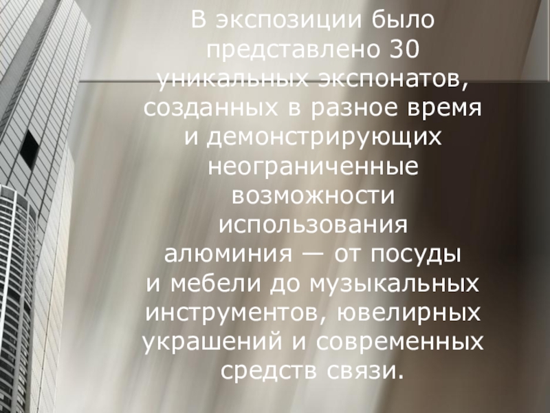 Слайд 1Первая в России выставка уникальных предметов, сделанных из алюминия.
