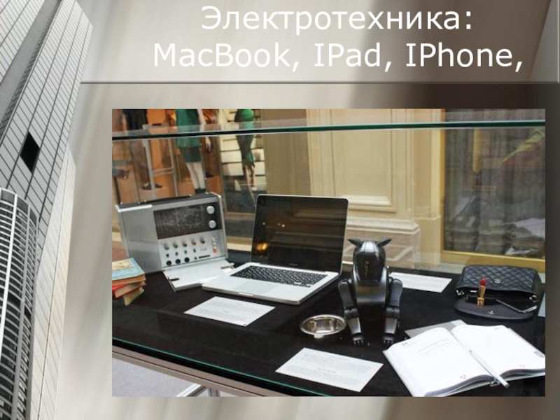 Слайд 23Электротехника: MacBook, IPad, IPhone,