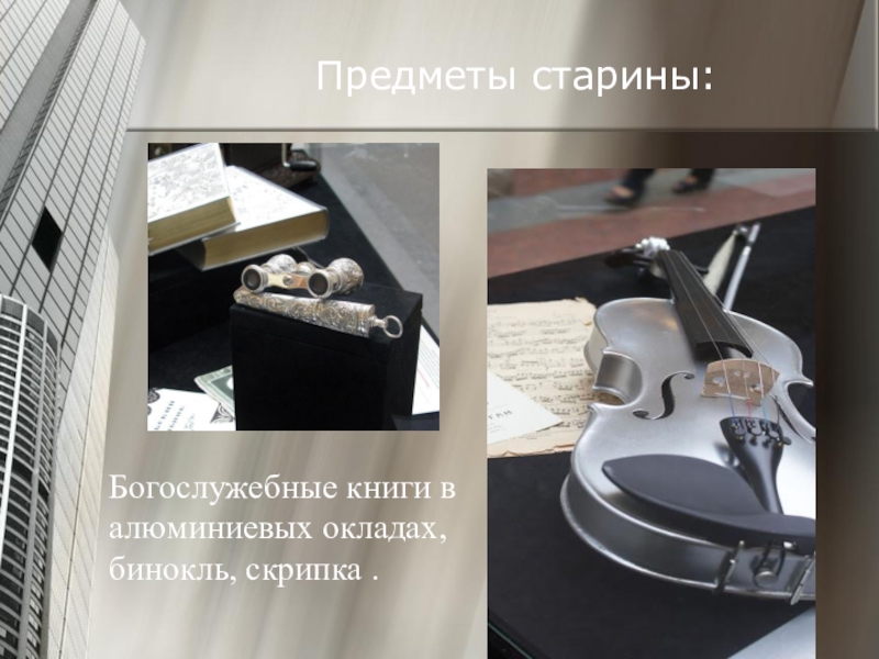 Предметы старины:Богослужебные книги в алюминиевых окладах, бинокль, скрипка .