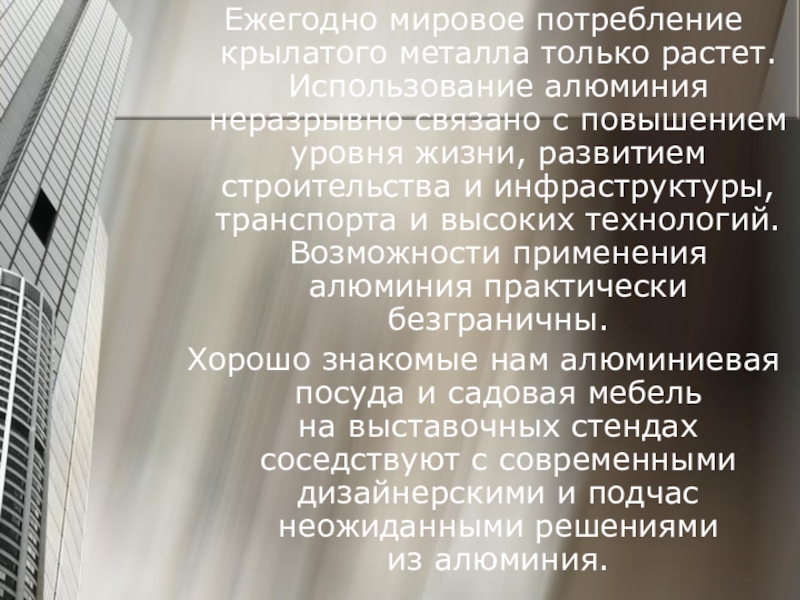 Ежегодно мировое потребление крылатого металла только растет. Использование алюминия неразрывно связано с повышением уровня жизни, развитием строительства и инфраструктуры,