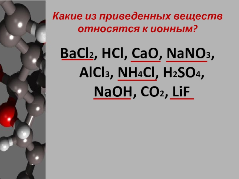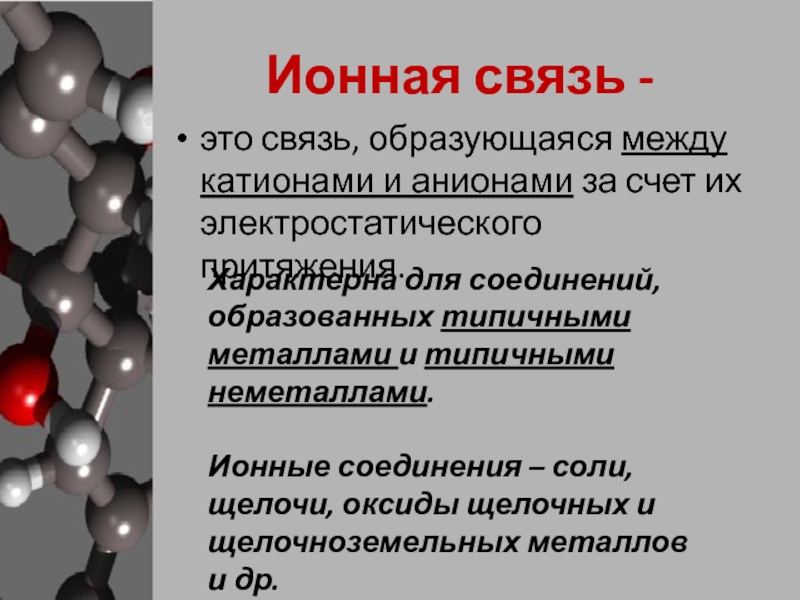 Ионные соединения – соли, щелочи, оксиды щелочных и щелочноземельных металлов и др.