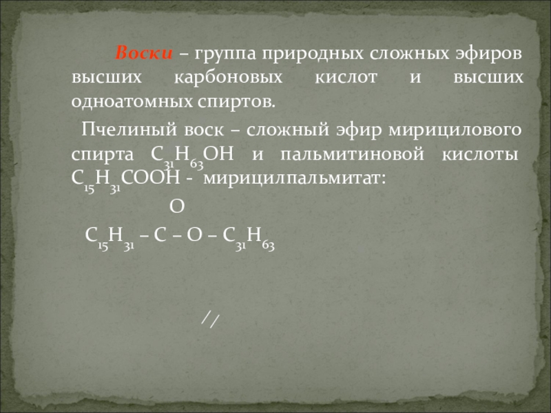 Пчелиный воск – сложный эфир мирицилового спирта С31Н63ОН и пальмитиновой кислоты С15Н31СООН - мирицилпальмитат: