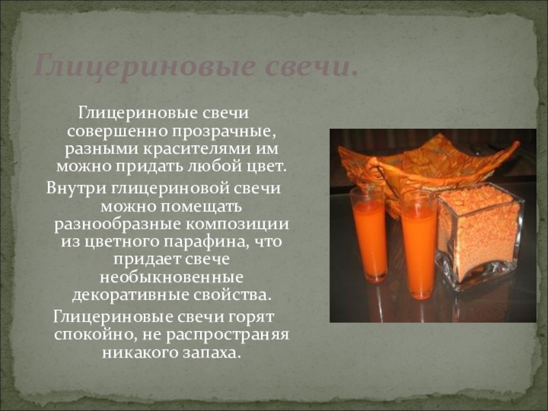 Внутри глицериновой свечи можно помещать разнообразные композиции из цветного парафина, что придает свече необыкновенные декоративные свойства.