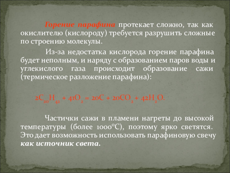 Из-за недостатка кислорода горение парафина будет неполным, и наряду с образованием паров воды и углекислого газа происходит образование сажи (термическое разложение парафина):