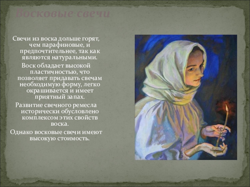 Развитие свечного ремесла исторически обусловлено комплексом этих свойств воска.