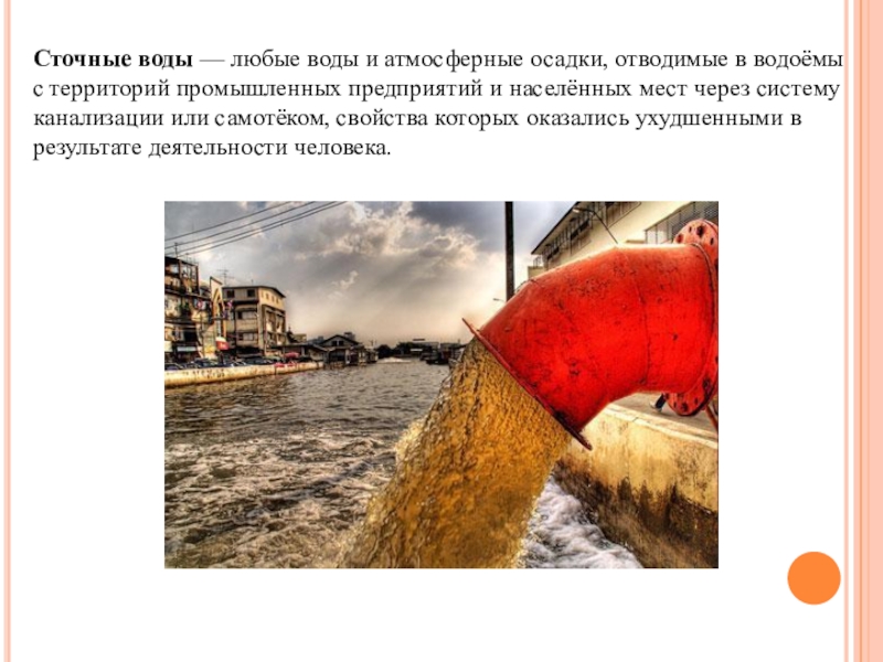 Слайд 17Сточные воды — любые воды и атмосферные осадки, отводимые в водоёмы с территорий промышленных