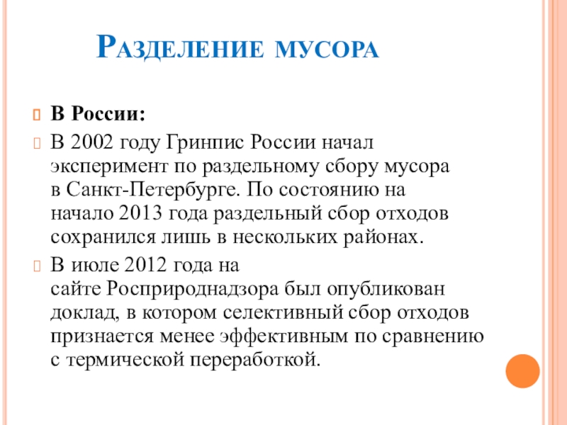 сбору мусора в Санкт-Петербурге. По состоянию на начало 2013 года раздельный сбор отходов сохранился лишь в нескольких районах.
