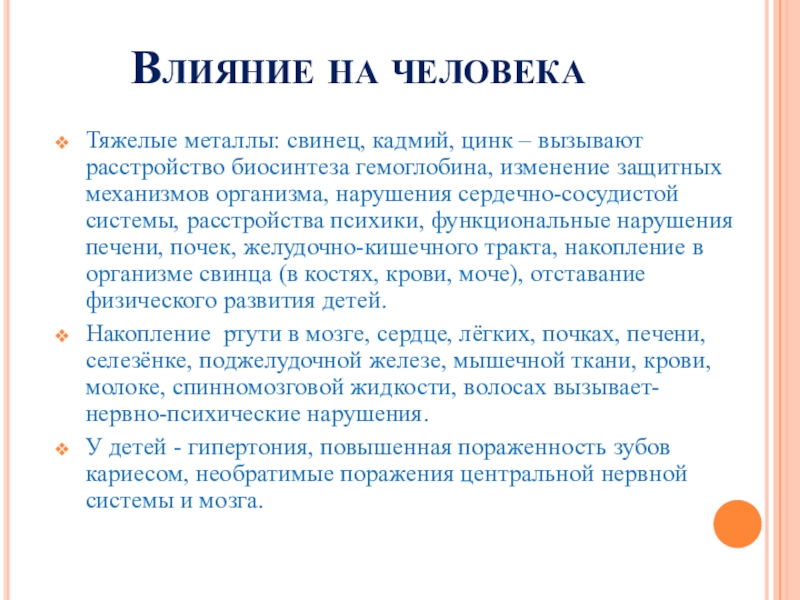цинк – вызывают расстройство биосинтеза гемоглобина, изменение защитных механизмов организма, нарушения сердечно-сосудистой системы, расстройства психики, функциональные нарушения печени, почек, желудочно-кишечного тракта, накопление в организме свинца (в костях, крови, моче), отставание физического развития детей.