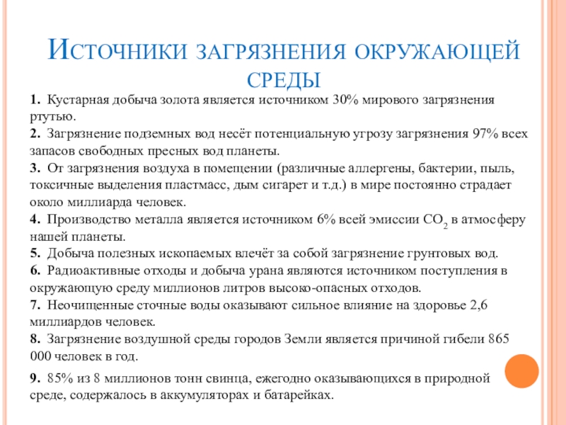 9. 85% из 8 миллионов тонн свинца, ежегодно оказывающихся в природной среде, содержалось в аккумуляторах и батарейках.