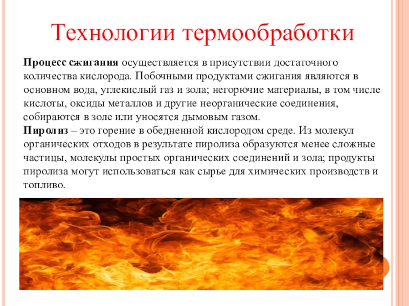 Пиролиз – это горение в обедненной кислородом среде. Из молекул органических отходов в результате пиролиза образуются менее сложные частицы, молекулы простых органических соединений и зола; продукты пиролиза могут использоваться как сырье для химических производств и топливо.