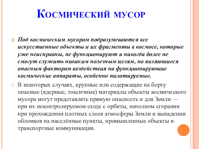 их фрагменты в космосе, которые уже неисправны, не функционируют и никогда более не смогут служить никаким полезным целям, но являющиеся опасным фактором воздействия на функционирующие космические аппараты, особенно пилотируемые.