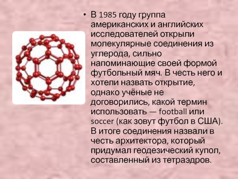 из углерода, сильно напоминающие своей формой футбольный мяч. В честь него и хотели назвать открытие, однако учёные не договорились, какой термин использовать — football или soccer (как зовут футбол в США). В итоге соединения назвали в честь архитектора, который придумал геодезический купол, составленный из тетраэдров.