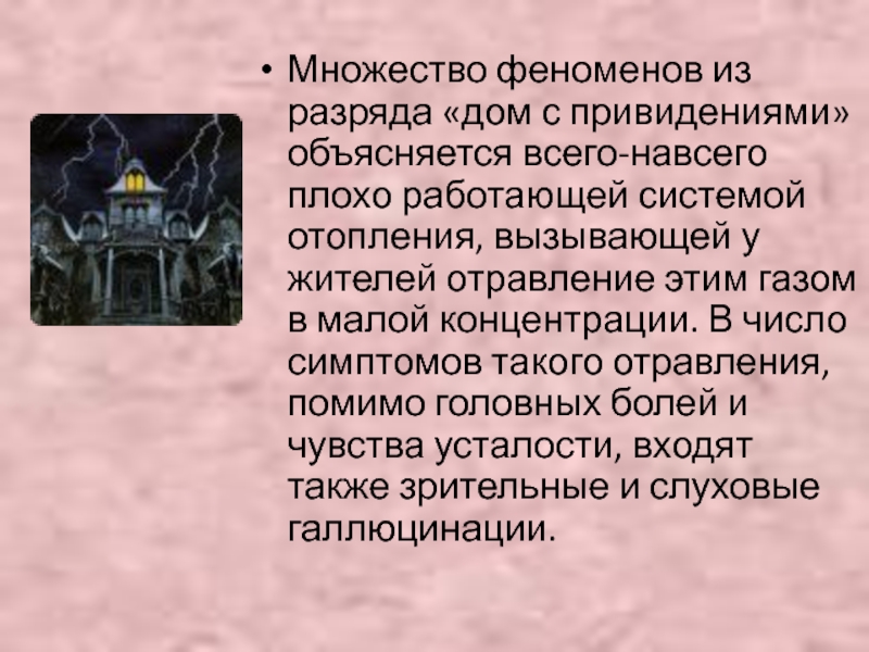 системой отопления, вызывающей у жителей отравление этим газом в малой концентрации. В число симптомов такого отравления, помимо головных болей и чувства усталости, входят также зрительные и слуховые галлюцинации.