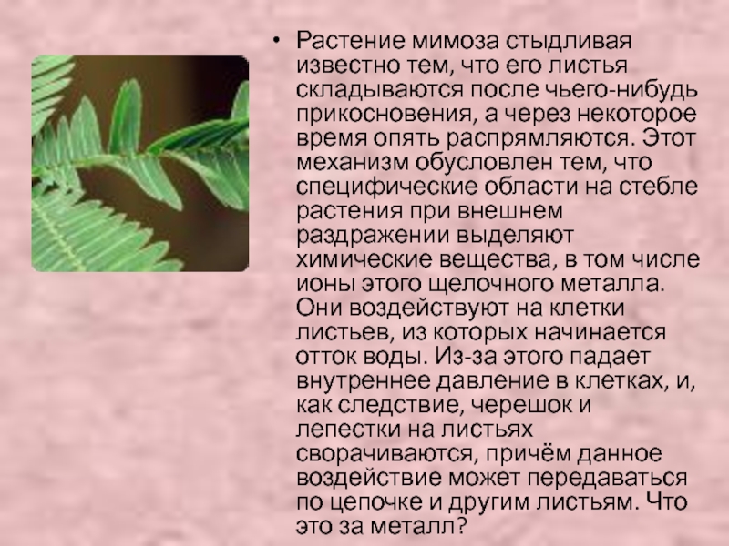 прикосновения, а через некоторое время опять распрямляются. Этот механизм обусловлен тем, что специфические области на стебле растения при внешнем раздражении выделяют химические вещества, в том числе ионы этого щелочного металла. Они воздействуют на клетки листьев, из которых начинается отток воды. Из-за этого падает внутреннее давление в клетках, и, как следствие, черешок и лепестки на листьях сворачиваются, причём данное воздействие может передаваться по цепочке и другим листьям. Что это за металл?