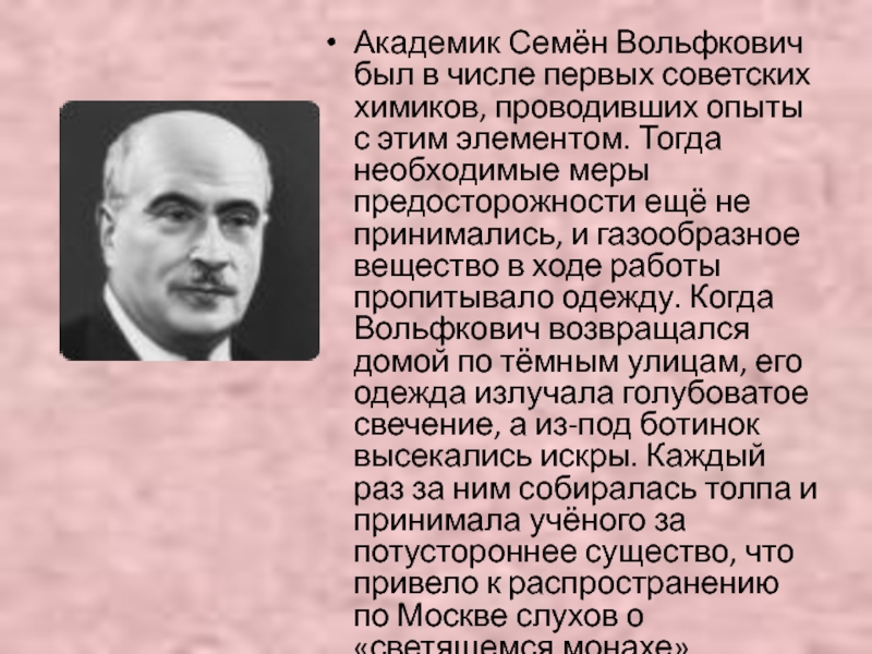 Слайд 24Академик Семён Вольфкович был в числе первых советских химиков, проводивших опыты