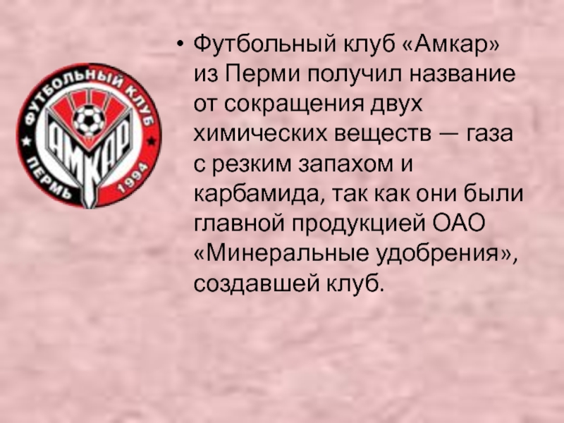 Слайд 14Футбольный клуб «Амкар» из Перми получил название от сокращения двух химических