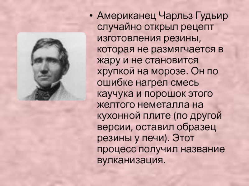 Слайд 38Американец Чарльз Гудьир случайно открыл рецепт изготовления резины, которая не размягчается