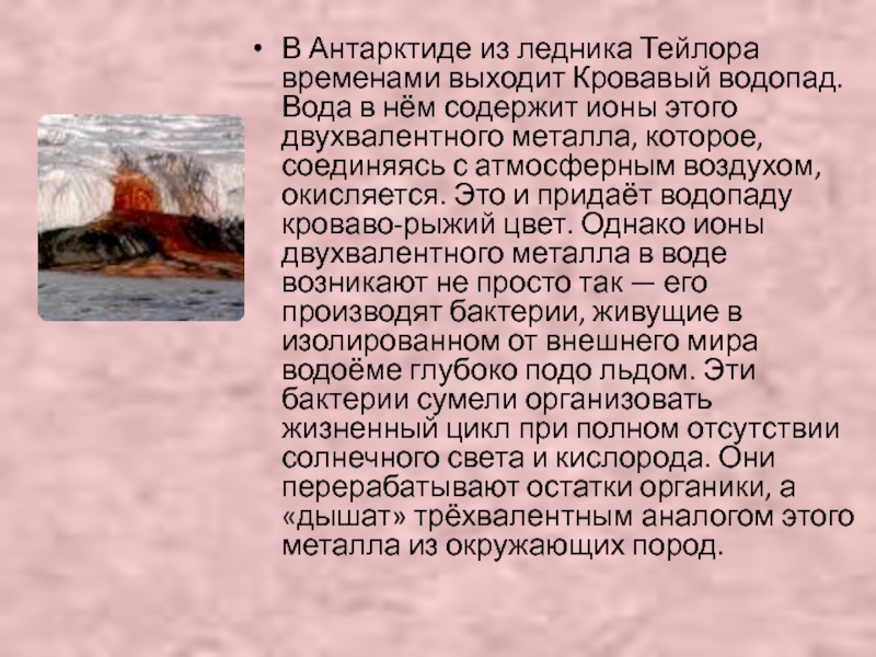 Слайд 18В Антарктиде из ледника Тейлора временами выходит Кровавый водопад. Вода в