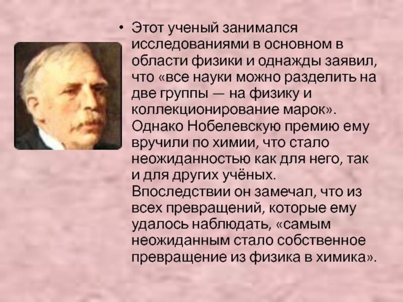 заявил, что «все науки можно разделить на две группы — на физику и коллекционирование марок». Однако Нобелевскую премию ему вручили по химии, что стало неожиданностью как для него, так и для других учёных. Впоследствии он замечал, что из всех превращений, которые ему удалось наблюдать, «самым неожиданным стало собственное превращение из физика в химика».