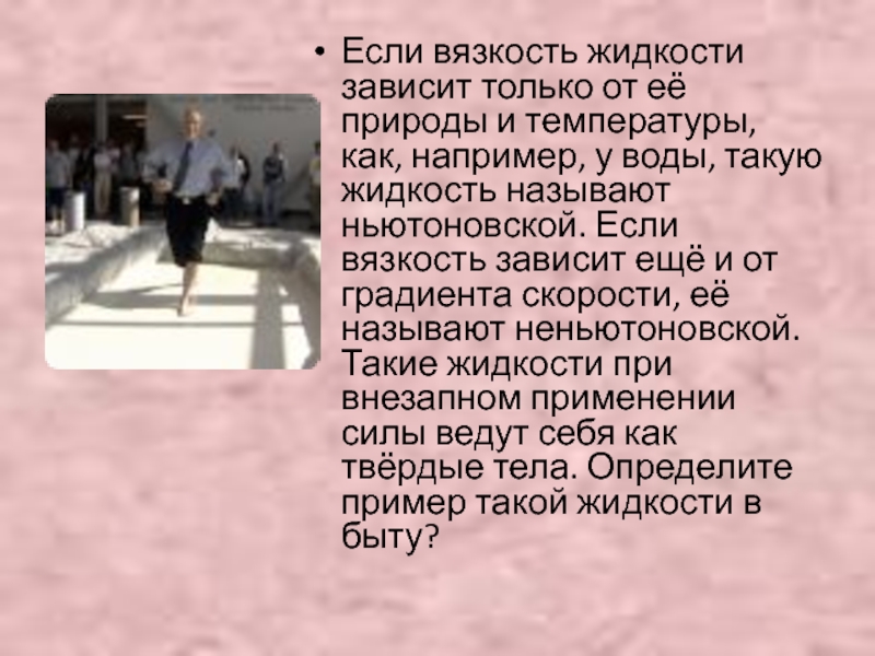 например, у воды, такую жидкость называют ньютоновской. Если вязкость зависит ещё и от градиента скорости, её называют неньютоновской. Такие жидкости при внезапном применении силы ведут себя как твёрдые тела. Определите пример такой жидкости в быту?