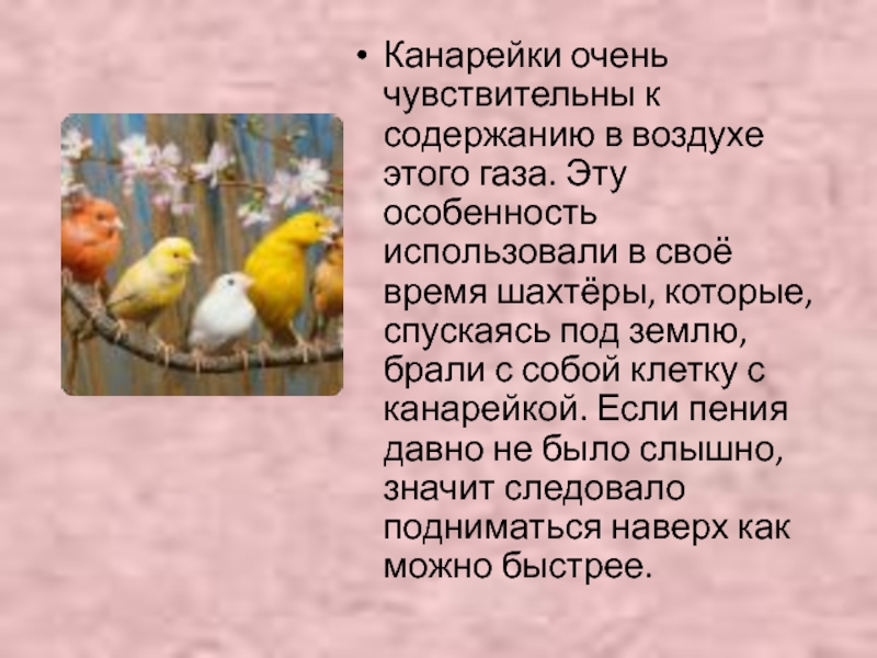Слайд 36Канарейки очень чувствительны к содержанию в воздухе этого газа. Эту особенность