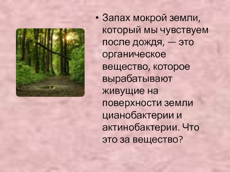 Слайд 34Запах мокрой земли, который мы чувствуем после дождя, — это органическое