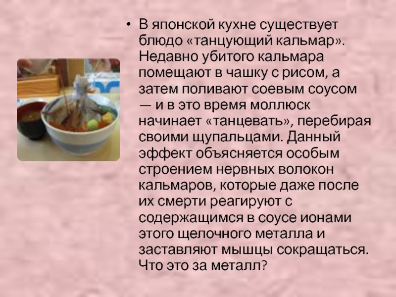 в чашку с рисом, а затем поливают соевым соусом — и в это время моллюск начинает «танцевать», перебирая своими щупальцами. Данный эффект объясняется особым строением нервных волокон кальмаров, которые даже после их смерти реагируют с содержащимся в соусе ионами этого щелочного металла и заставляют мышцы сокращаться. Что это за металл?