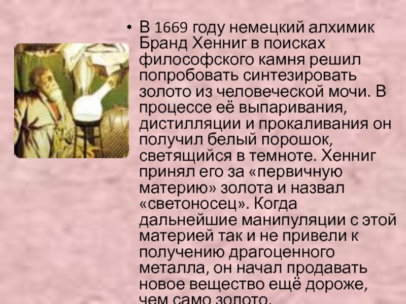 Слайд 20В 1669 году немецкий алхимик Бранд Хенниг в поисках философского камня