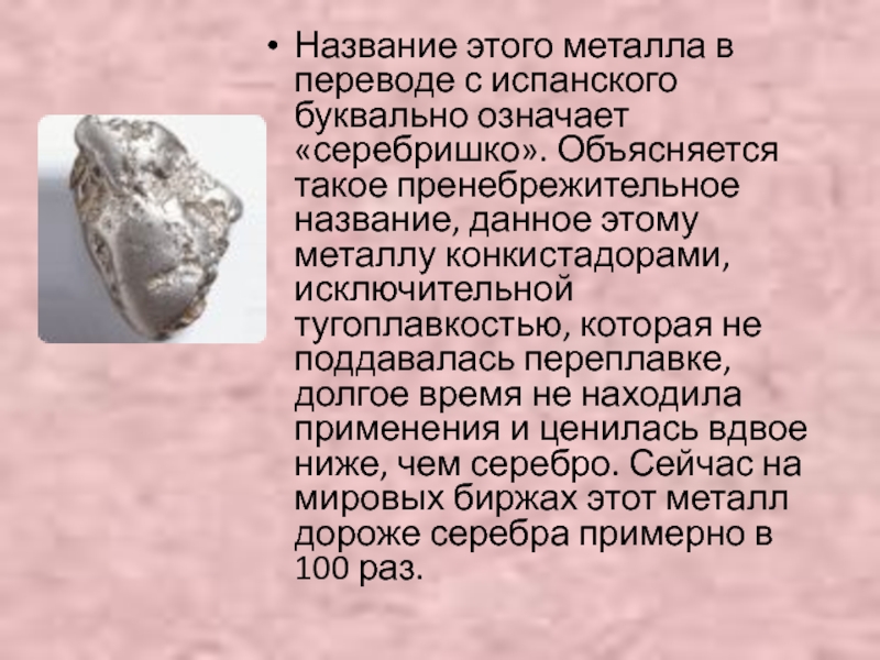 Слайд 32Название этого металла в переводе с испанского буквально означает «серебришко». Объясняется