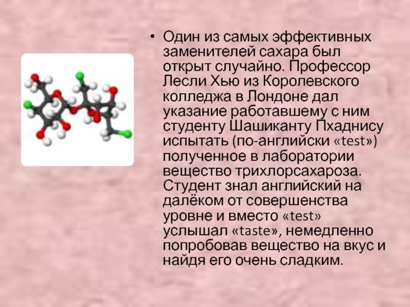 Слайд 4Один из самых эффективных заменителей сахара был открыт случайно. Профессор Лесли
